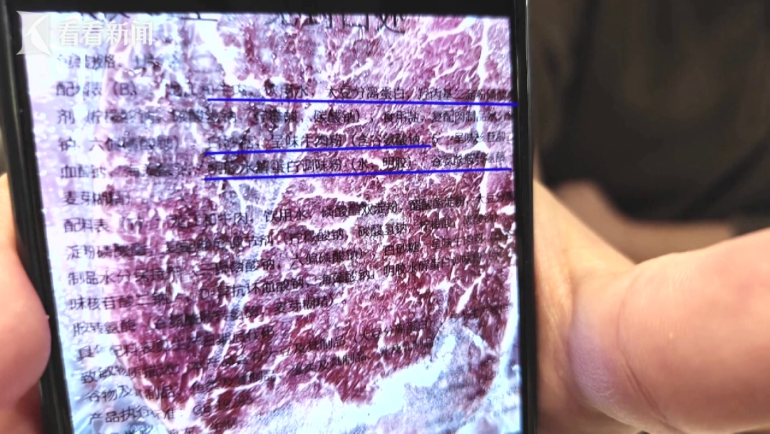 在记者的坚持下,其中一家的店员翻拍了生牛排包装上的配料表,配料表上除了牛肉外,还有长长一串配料和添加剂,包括了大豆分离蛋白、明胶、呈味牛肉粉等等。包装上还注明有致敏物质信息,包含大豆、鱼类、谷物及其制品。