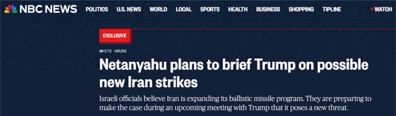 NBC的报道援引知情人士的话说,特朗普与内塔尼亚胡预计将于本月晚些时候举行会晤。内塔尼亚胡届时或将以“伊朗弹道导弹项目的扩张不仅将对以色列构成威胁,也会危及地区安全及美国相关利益”为由,向特朗普提出“美军参与或协助该军事行动”的选项。