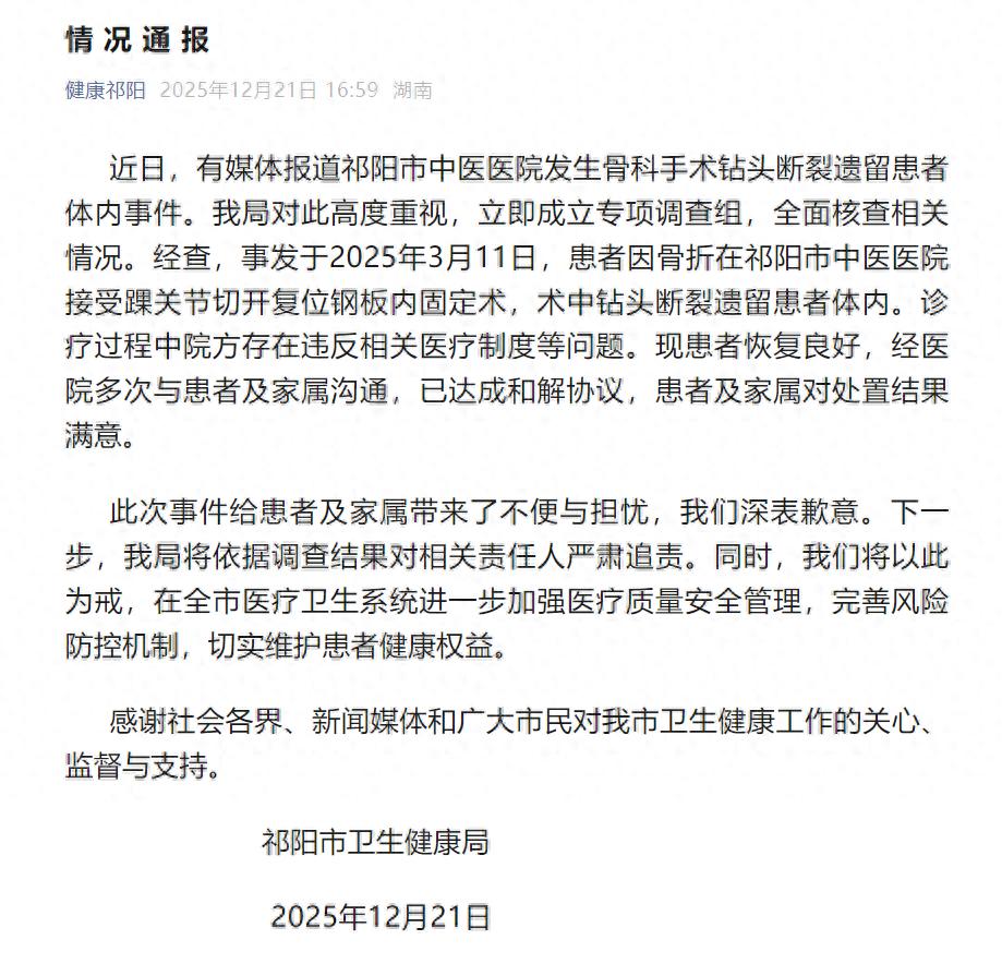 近日,有媒体报道祁阳市中医医院发生骨科手术钻头断裂遗留患者体内事件。我局对此高度重视,立即成立专项调查组,全面核查相关情况。经查,事发于2025年3月11日,患者因骨折在祁阳市中医医院接受踝关节切开复位钢板内固定术,术中钻头断裂遗留患者体内。诊疗过程中院方存在违反相关医疗制度等问题。现患者恢复良好,经医院多次与患者及家属沟通,已达成和解协议,患者及家属对处置结果满意。