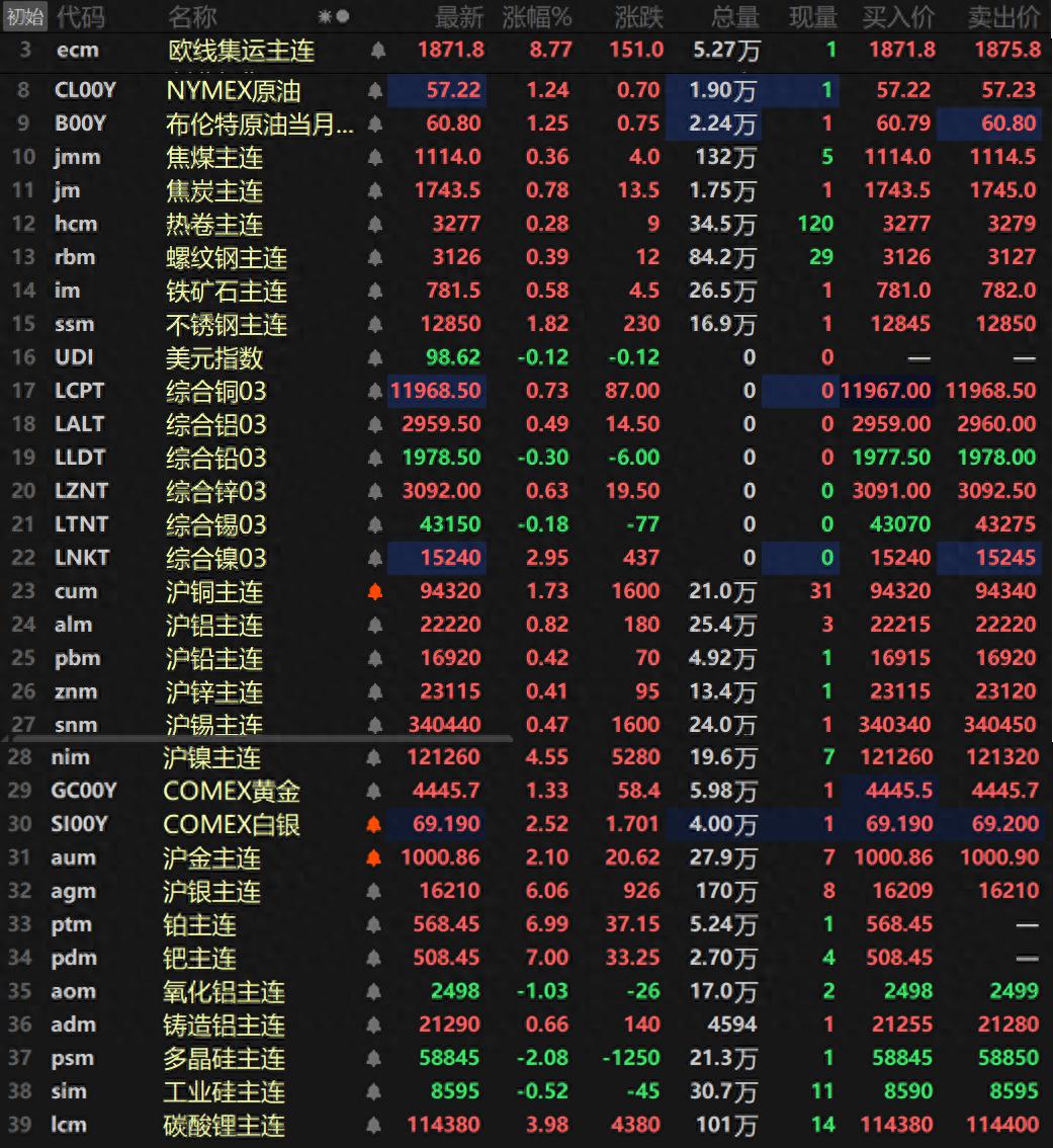 此外,碳酸锂主连涨3.98%,盘中最高冲至116460元/吨,刷新2024年4月以来的新高。多晶硅主连跌2.08%,工业硅主连跌0.52%。欧线集运主连涨8.77%报1871.8。