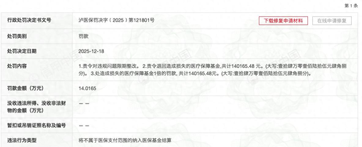 信用中国官网最新行政处罚信息显示,近日,连锁药店龙头一心堂(002727.SZ)旗下又一门店因医保基金结算违规被罚。