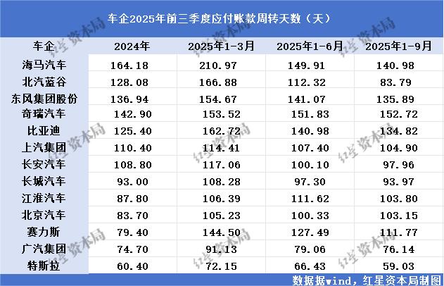 根据13家乘用车上市公司公布的2025年三季报,红星资本局梳理发现,应付账款周转天数普遍呈下降趋势。