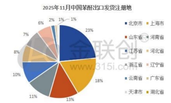 11月,中国苯酐出口货源仍主要来自华北及东部主要产业区。 北京市以2660吨的出口量位居第一,占比23.47%;上海市和山东省分别以2043吨和1466吨位列第二、三位,占比为18.03%和12.94%。河南省、江苏省、浙江省等地出口量均超过800吨,贡献稳定。前五大发货地合计占比超过六成,其地理分布与国内苯酐生产装置及港口物流枢纽的布局高度重合,环渤海、长三角等化工产业集群继续发挥出口主阵地作用。