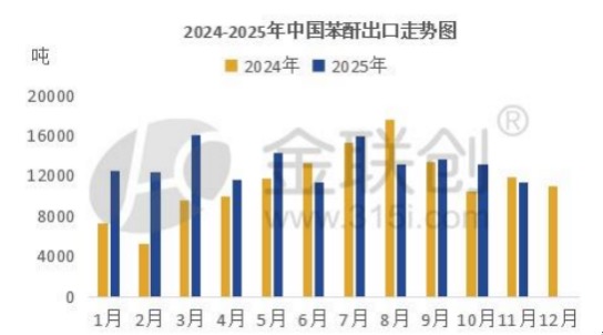 2025年11月,中国苯酐出口延续环比回落态势,但全年累计出口仍保持显著增长。海关数据显示,当月出口量为1.13万吨,同比小幅下降4.8%,环比减少13.6%;出口均价为775.29美元/吨,为年内较低水平。1-11月累计出口量达14.54万吨,同比增长15.36%,整体出口规模继续维持高位。从单月表现看,11月出口量虽环比下滑,但绝对规模仍处历史同期较好水平,这反映出海外市场的需求基础依然存在;出口价格的下行则与全球化工品市场整体趋弱及竞争加剧的格局相呼应,显示出国内企业在国际市场上通过价格策略维持出口竞争力的现状。
