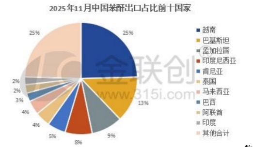 2025年11月,中国苯酐出口市场分布广泛,亚洲及新兴市场继续担当主力。 越南以2786吨的出口量稳居首位,占总量的24.6%,再次凸显其作为最大单一出口市场的地位。巴基斯坦和孟加拉国分别以1505吨和1015吨位列第二、三位,南亚和东南亚市场需求稳定。值得关注的是,向非洲的出口显著增长,其中肯尼亚(598吨)、埃及(56吨)、南非(140吨)等地均录得可观货量;拉美地区的哥伦比亚(222吨)、委内瑞拉(223吨)、巴西(280吨)等也成为重要目的地。前十大贸易伙伴合计占比约七成,整体格局呈现以亚洲为核心、向“一带一路”沿线及新兴市场深度拓展的特征,显示出中国苯酐全球供应链的多元性与韧性。