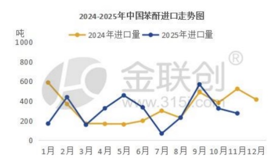 2025年11月,中国苯酐进口呈现量价齐跌、规模收缩格局。海关数据显示,11月进口量为274.96吨,环比减少15.3%,同比大幅下降47.6%;进口均价为1023.83美元/吨,较前期有所回落。1-11月累计进口量为3360吨,较2024年同期的3586.5吨下降6.3%。从单月看,进口量收缩明显,主要源于国内供应充足、进口替代效应增强。进口来源高度集中,韩国位居第一,占总进口量的71%;其次是中国台湾占比27%,两者合计占比超过98%。收货地则主要集中在广东省和上海市。未来,在国内苯酐产能过剩常态下,出口仍将是平衡国内供需的重要渠道,而进口料将继续保持在补充性、结构性的低位区间。(金联创苯酐分析师:钱芳)