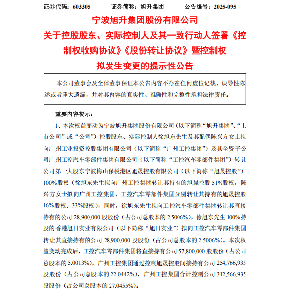 12月22日,旭升集团控股股东、实控人徐旭东及其配偶陈兴方,以及一致行动人宁波梅山保税港区旭晟控股有限公司(以下简称旭晟控股)、香港旭日实业有限公司(以下简称旭日实业)与广州工控集团、广州工控汽车零部件集团有限公司(以下简称工控汽车零部件集团)签署《关于宁波旭升集团股份有限公司控制权收购协议》。