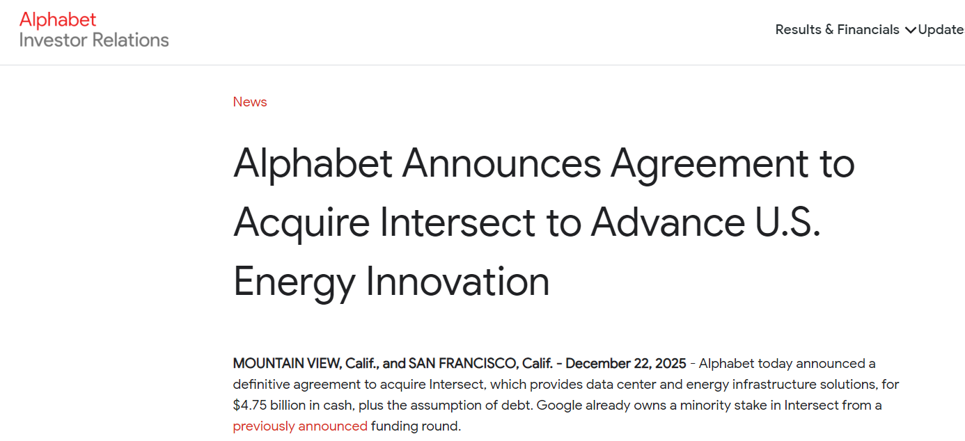 不过,Alphabet指出,Intersect在加州的运营及在建资产,以及其在得克萨斯州已有的部分运营资产,将不包含在此次收购范围内。该交易预计将在2026年上半年完成,但仍需满足常规的交割条件。