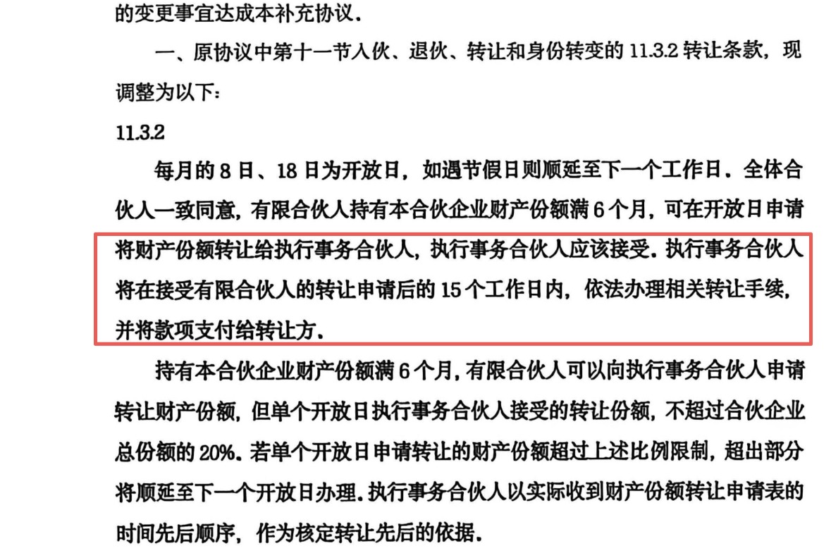 其补充协议进一步明确,有限合伙人持有合伙企业财产份额满6个月后,可在开放日要求执行事务合伙人受让其财产份额,后者应在15个工作日内办理转让并支付款项。