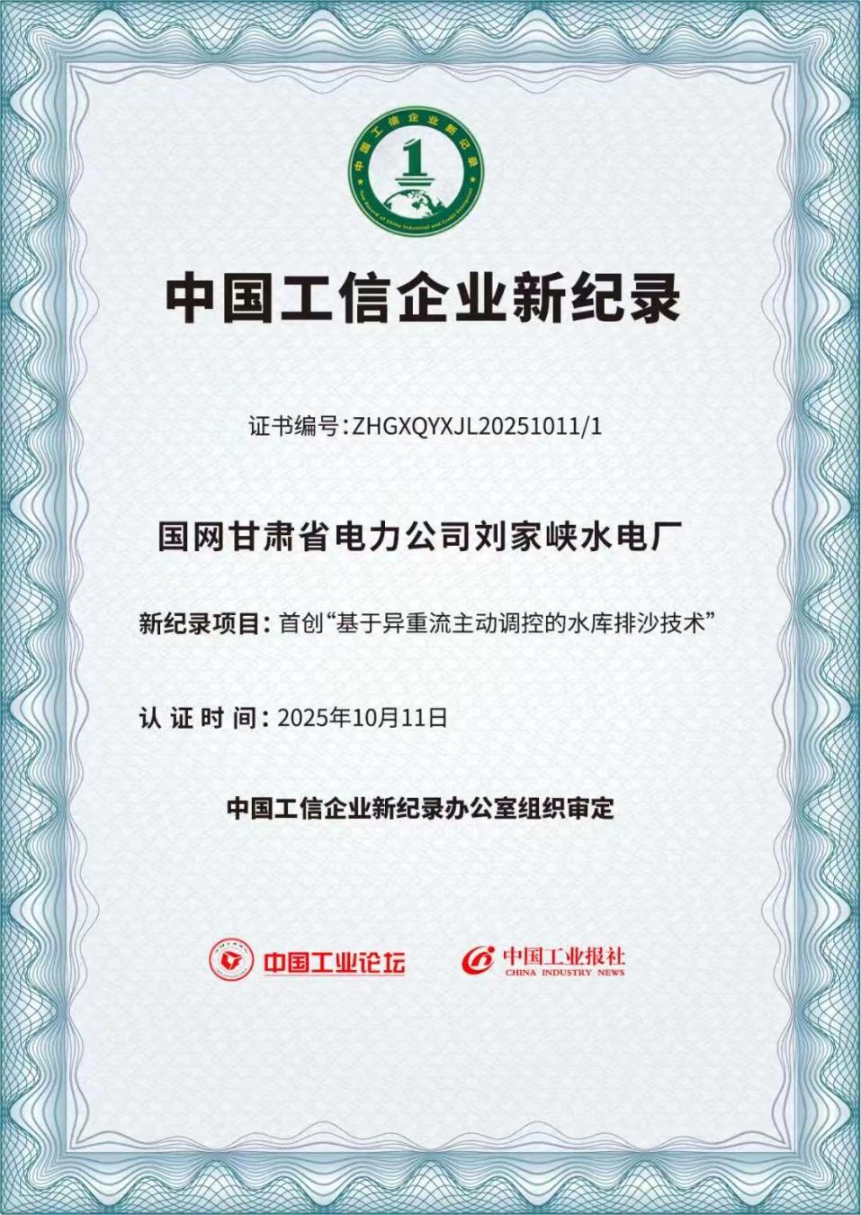 12月16日,2025中国工信企业新纪录发布研讨会在北京第十八届中国工业论坛举行,由国网甘肃刘家峡水电厂申报的“全国首创基于异重流主动调控的水库排沙技术”获中国工信企业新纪录认证,国网甘肃刘家峡水电厂被授牌“中国工信企业新纪录产研实践基地”并作为三家代表企业之一作专题报告。