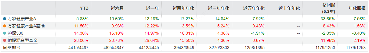 以万家健康产业混合A(010054)为例,该基金近期业绩表现乏力。2025年中报显示,万家健康产业混合A上半年复权单位净值增长率仅为2.35%,在138只同类可比基金中排名第137位,处于行业末尾水平。
