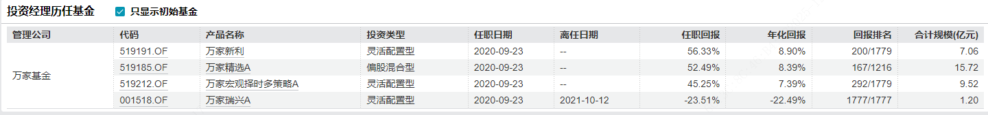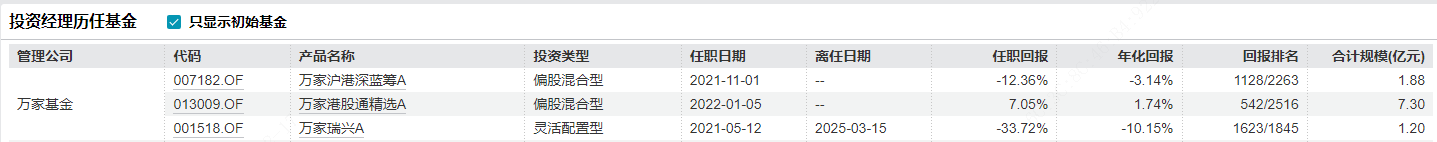 2024年新上任的基金经理刘宏达其管理的万家瑞兴A,任职不足四年回报率为-33.72%,最大回撤达-10.15%,在同类1845只基金中排名1623位,处于后2%的末尾区间。