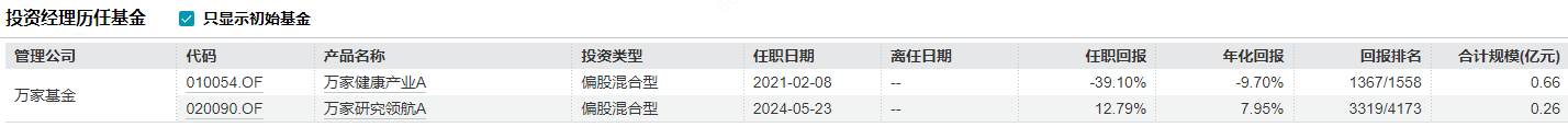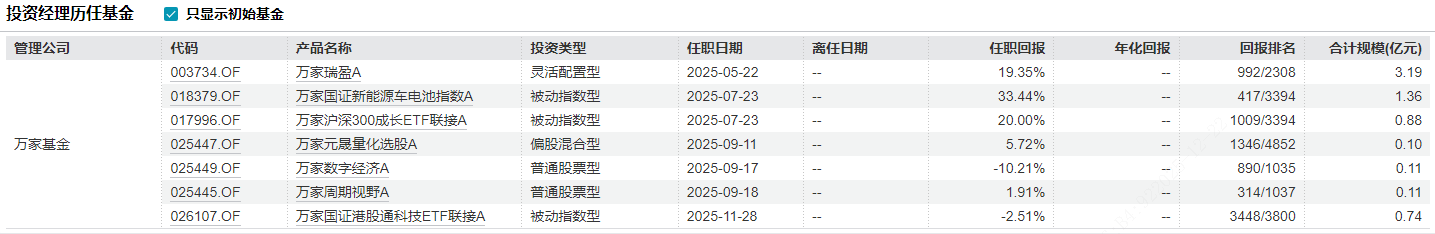 近年来,公司启用了一些新生代基金经理。例如基金经理王霄音,根据wind数据库显示,截止至2025年12月17日,其管理的两只基金业绩分化明显,万家研究领航A近一年收益达19.13%,但万家健康产业A同期收益为-8.74%,且在同类排名垫底。