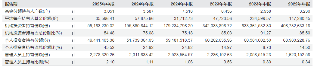 持有人结构也发生巨变。根据半年报,尽管机构持有份额占比仍达54.48%,但从份额变动轨迹看,机构投资者已持续大额赎回,2024年四季度单季赎回份额达0.02亿份,2025年上半年个人投资者占比已从年初的37%升至45.52%。