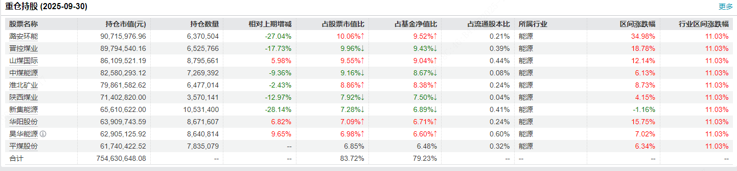 2025年三季报显示,该基金前十大重仓股仍有6只煤炭股,占比高达42%,而同期煤炭板块跌幅达28%,直接拖累净值。