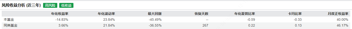 根据wind数据库显示,该基金区间年化夏普比率为-0.59%,低于同类平均水平;月度正收益率为40.00%,低于同类平均水平。