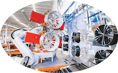 安徽今飞轮毂有限公司的智能化车间内,六条全自动化产线高效运转,工人有序协作,一批批新能源汽车轮毂顺利下线。