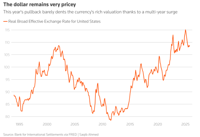 国际清算银行数据显示,10月美元实际广义有效汇率指数——即经通胀调整后相对于一篮子非美货币的价值,为108.7,较1月创下的历史高点115.1仅小幅回落,这表明美元可能仍处于被高估的状态。