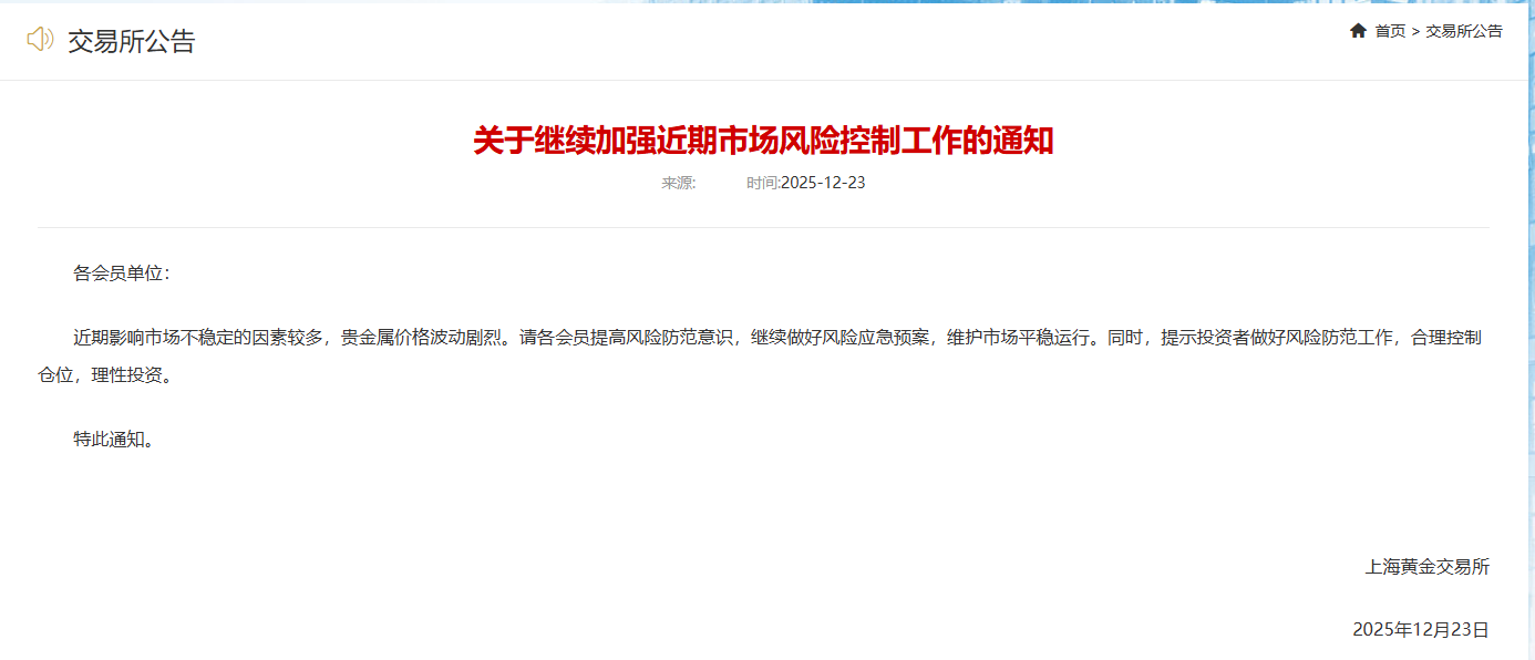 12月23日,上金所公告称,近期影响市场不稳定的因素较多,贵金属价格波动剧烈。请各会员提高风险防范意识,继续做好风险应急预案,维护市场平稳运行。同时,提示投资者做好风险防范工作,合理控制仓位,理性投资。