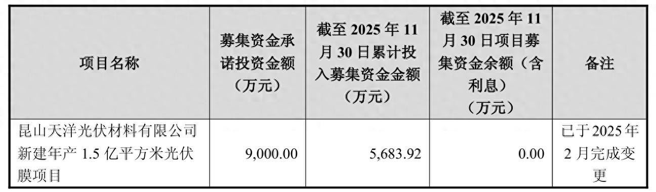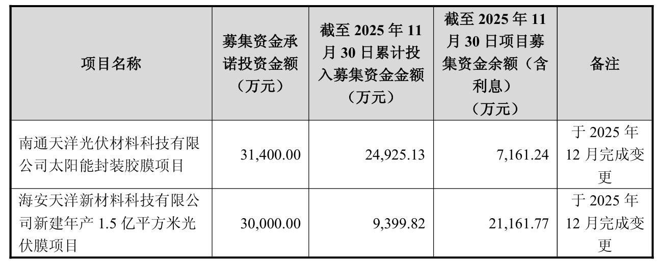 截至2025年11月30日,昆山天洋光伏材料有限公司新建年产1.5亿平方米光伏膜项目、南通天洋光伏材料科技有限公司太阳能封装胶膜项目、海安天洋新材料科技有限公司新建年产1.5亿平方米光伏膜项目投入募集资金金额分别为5683.92万元、2.49亿元、9399.82万元,合计投入募资金额约4亿元。
