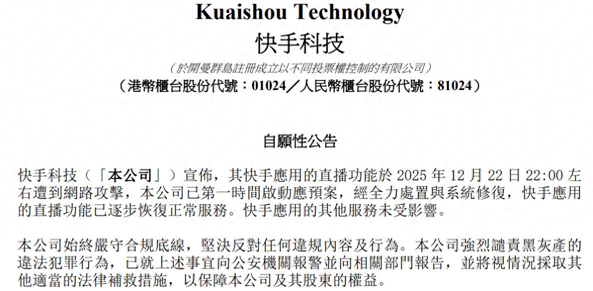 快手(1024.HK)12月23日午间发布公告称,公司快手应用的直播功能于2025年12月22日22:00左右遭到网路攻击,公司已第一时间启动应预案,经全力处置与系统修复,快手应用的直播功能已逐步恢复正常服务。快手应用的其他服务未受影响。
