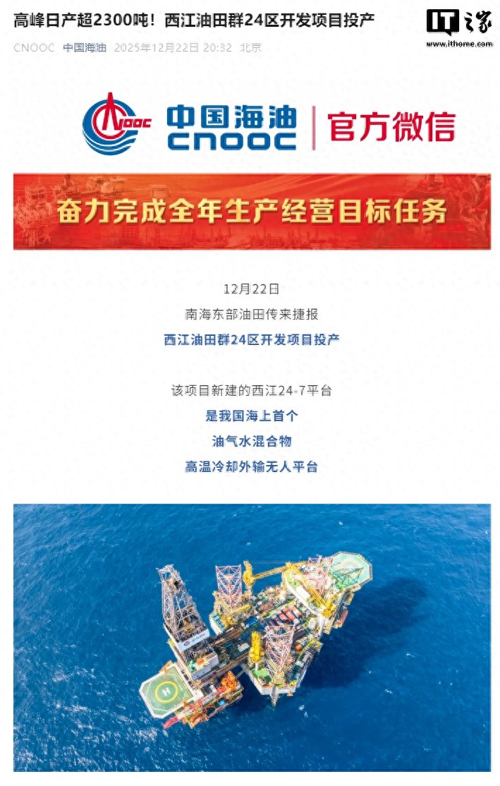 据中国海油、科技日报今日消息,随着西江油田群 24 区开发项目的成功投产,我国首次实现海上无人平台油气水混合物高温冷却外输,为保障国家能源安全提供有力支撑。