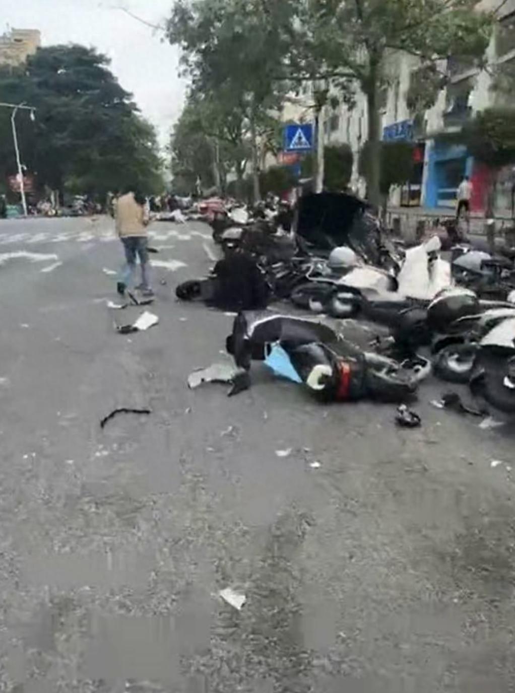 华商报大风新闻记者通过事发现场照片及监控录像看到,一黑色轿车在福州仓山区亭头路与金洲南路交叉口行驶时突然加速,连续撞上4辆正在行驶的电动车,有驾驶员被撞飞,随后该轿车又撞入路边的电动车停放区,造成多辆电动车受损。