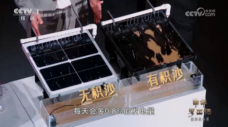 节目中,童洪波深入浅出地阐释了光伏发电原理:“光伏发电的核心是光生伏特效应——半导体材料吸收太阳光后,内部电子形成电流,从而将光能直接转化为电能。”通过现场对比展示,他直观说明了隆基BC防积灰产品如何借助特殊的边框设计,充分利用雨水冲刷带走灰尘,有效化解光伏电站长期面临的积灰难题。