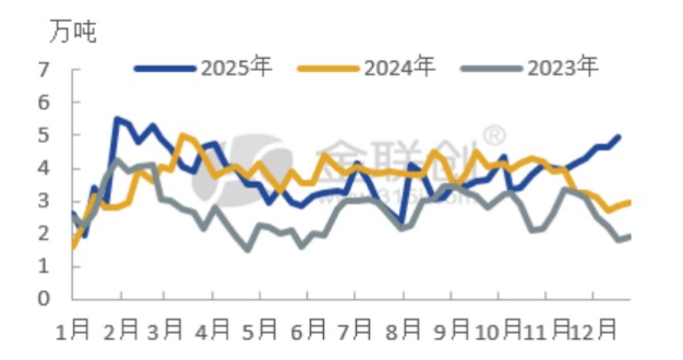 据金联创数据监测,相比近两年同期库存数据,2025年12月份库存明显增加,且近几年呈现逐年递增趋势。从下表数据可以看出,2023-2025年春节后库存较上年末库存均增幅明显,结合目前华东港口库存量,目前需求情况及今年春节晚于去年的现实,故笔者在此保守估计2026年春节后华东库存或在8.70万吨左右,春节后库存或将累至新高。