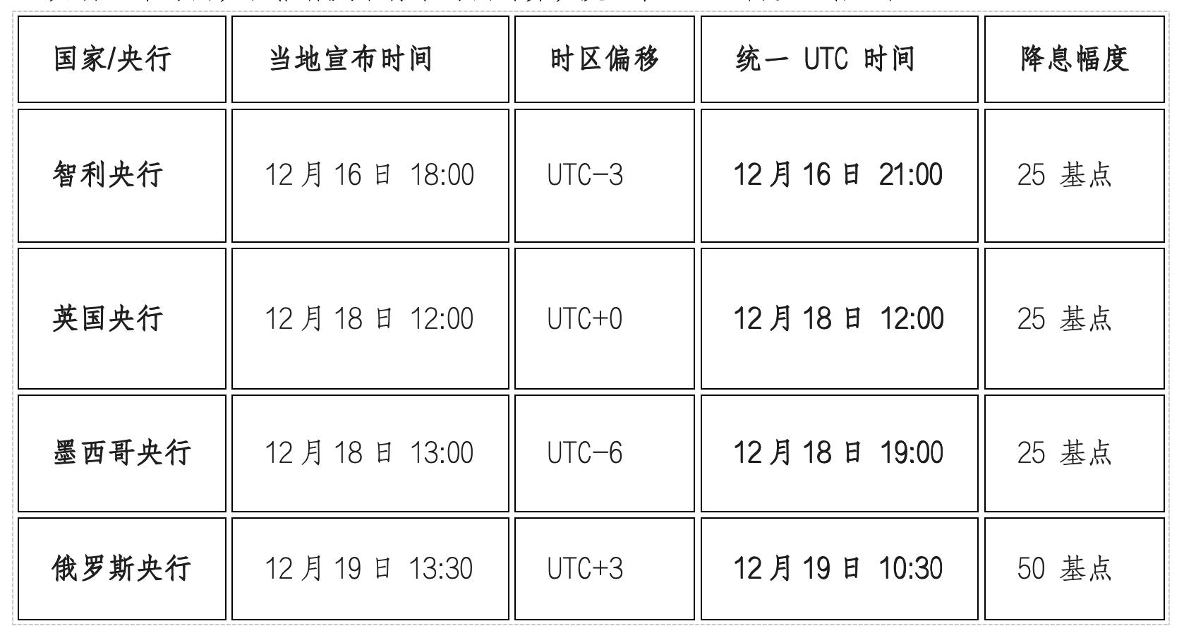 事实上,在两天半内,至少四家央行宣布降息:智利央行在当地时间12月16日宣布将基准利率从4.75%下调至4.5%,完成年内第二次降息。英国央行则在当地时间12月18日宣布将基准利率下调25个基点至3.75%;同日,墨西哥央行也宣布将基准利率下调25个基点至7%。俄罗斯央行则于当地时间12月19日宣布,将基准利率下调50个基点至16%。(以上四家央行宣布时间,以格林威治标准时间计算,发生在2.5天内。记者注)