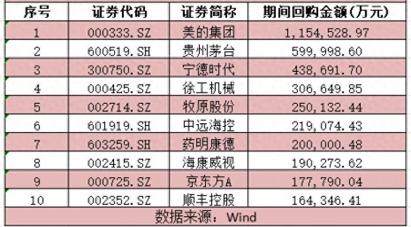此外,贵州茅台和宁德时代分别以60亿元和43.87亿元的回购金额位列第二、三位,徐工机械和牧原股份则以30.66亿元和25亿元的回购金额跻身第四和第五。