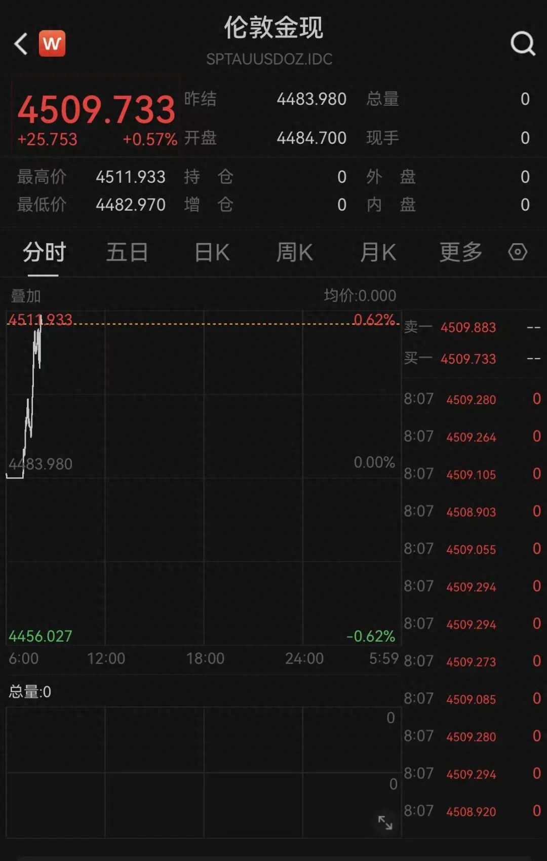 24日,现货黄金继续拉升,盘中最高触及4511.93美元/盎司,截至发稿涨0.57%,报4509.73美元/盎司,再创历史新高。数据显示,现货黄金价格年内上涨了约1880美元/盎司。