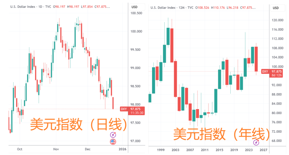 截至发稿,美元指数也在周二持续下跌,目前已经处于10月初以来的低点。年初至今,美元指数已经下跌超9%,稍稍再多跌一些,就将创出2002年以来的最大年度跌幅。
