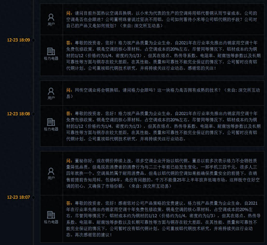 格力电器 12 月 23 日在互动平台表示,公司暂时没有铝代铜计划。
