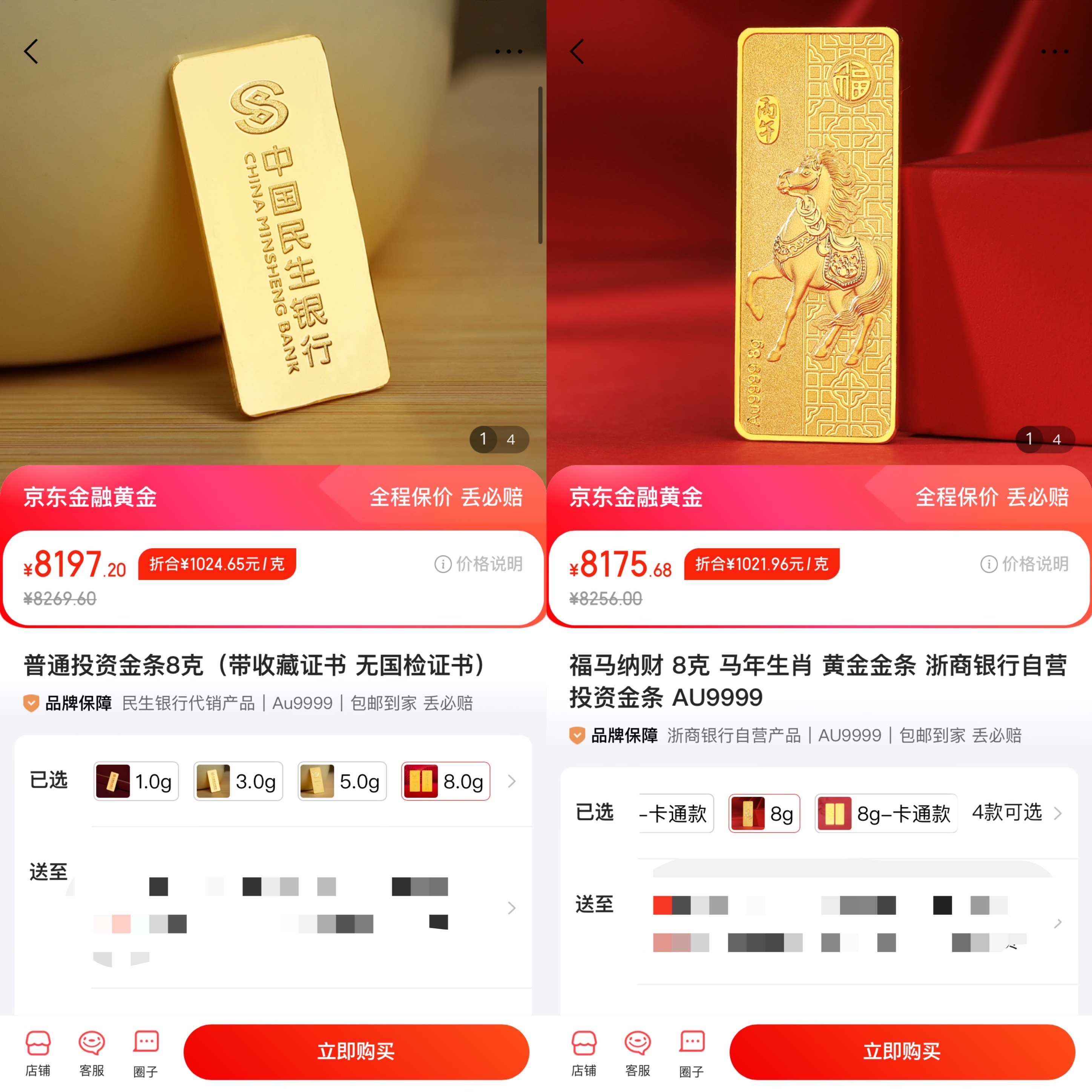 23日13时许,京东金融App显示,浙商银行马年投资金条为1021.96元/克,8克金条价格为8175.68元;民生银行普通投资金条为1024.65元/克,8克金条价格为8197.20元。