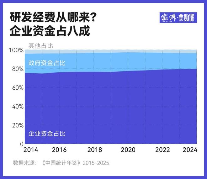 从研发经费的资金构成看,企业已是中国科研的主力军。根据国家统计局在其官网最新发布的《中国统计年鉴2025》,2024年,全国研发经费达到了3.63万亿元,投入强度(经费与国内生产总值之比)为2.69%,接近经合组织国家(OECD)平均水平(2.73%)。而这其中,有79.5%的经费来自于企业,相较30年前的40.6%显著提升。