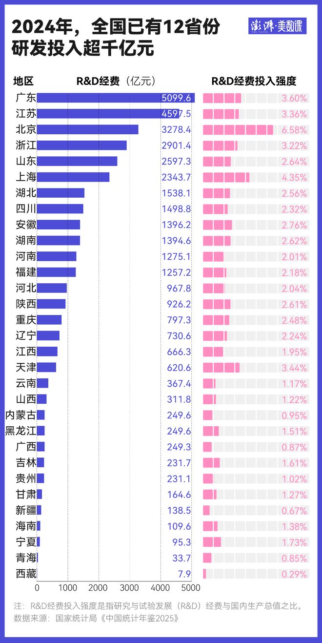 2024年,研发经费投入超千亿元的省份已从2014年的4个增长到了12个,这些省份也是2024年GDP排名最高的12个。