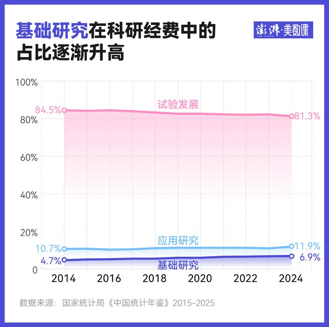 2024年,全国基础研究、应用研究和试验发展经费支出占比分别为6.9%、11.0%和82.2%。所谓的基础研究,是指不预设任何特定应用或使用目的的实验性或理论性工作,应用研究则是探索基础研究成果的可能用途,而试验发展则是为开发新的产品、工艺或改进现有产品、工艺而做的系统性研究。