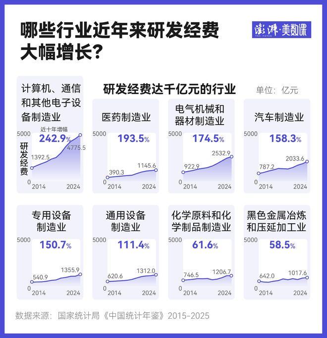 根据《中国统计年鉴2025》,去年在规模以上工业企业中,研发经费投入超过千亿元的行业共有8个,它们一共占到了所有规模以上工业企业研发经费的近七成。