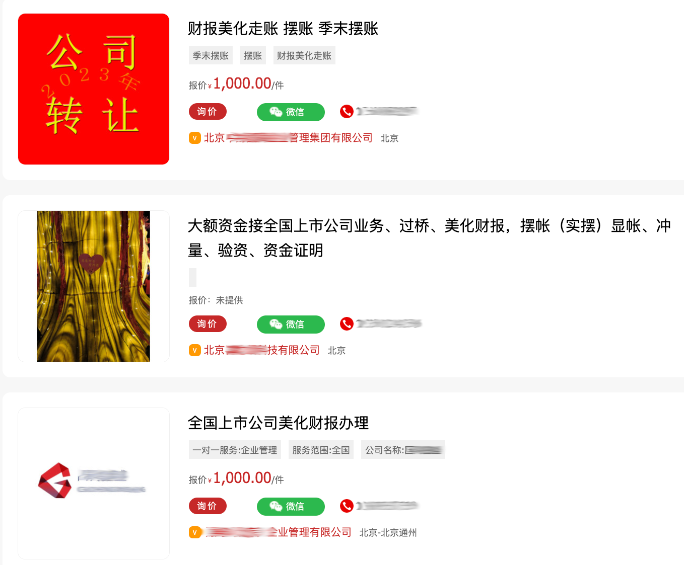 近期,每经记者在一些股票投资群中发现,有人发布“承接主板、科创板、创业板、港股、新三板上市公司及拟IPO企业12月底报表优化”等类似的业务推广信息。