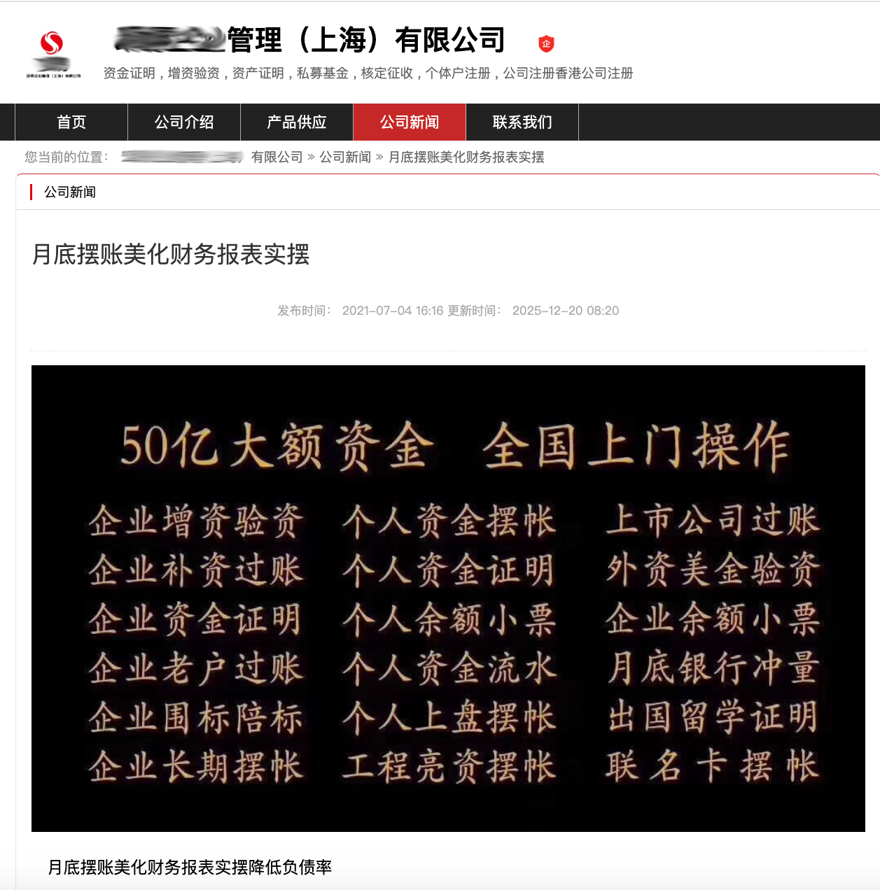 此外,记者在百度上搜索“摆账财报美化”,一家名为“某某企业管理(上海)有限公司”也在其网页上罗列“月底摆账、美化财务、实摆、降低负债率”等业务。记者通过网站上留下的电话号码加了对方微信,对方明确需要企业提供征信报告和“路径”,资金于2025年12月31日汇入,2026年1月4日转出,费用是1.9%。通过比对网站和“天眼查”所收录的该机构信息,二者高度一致。