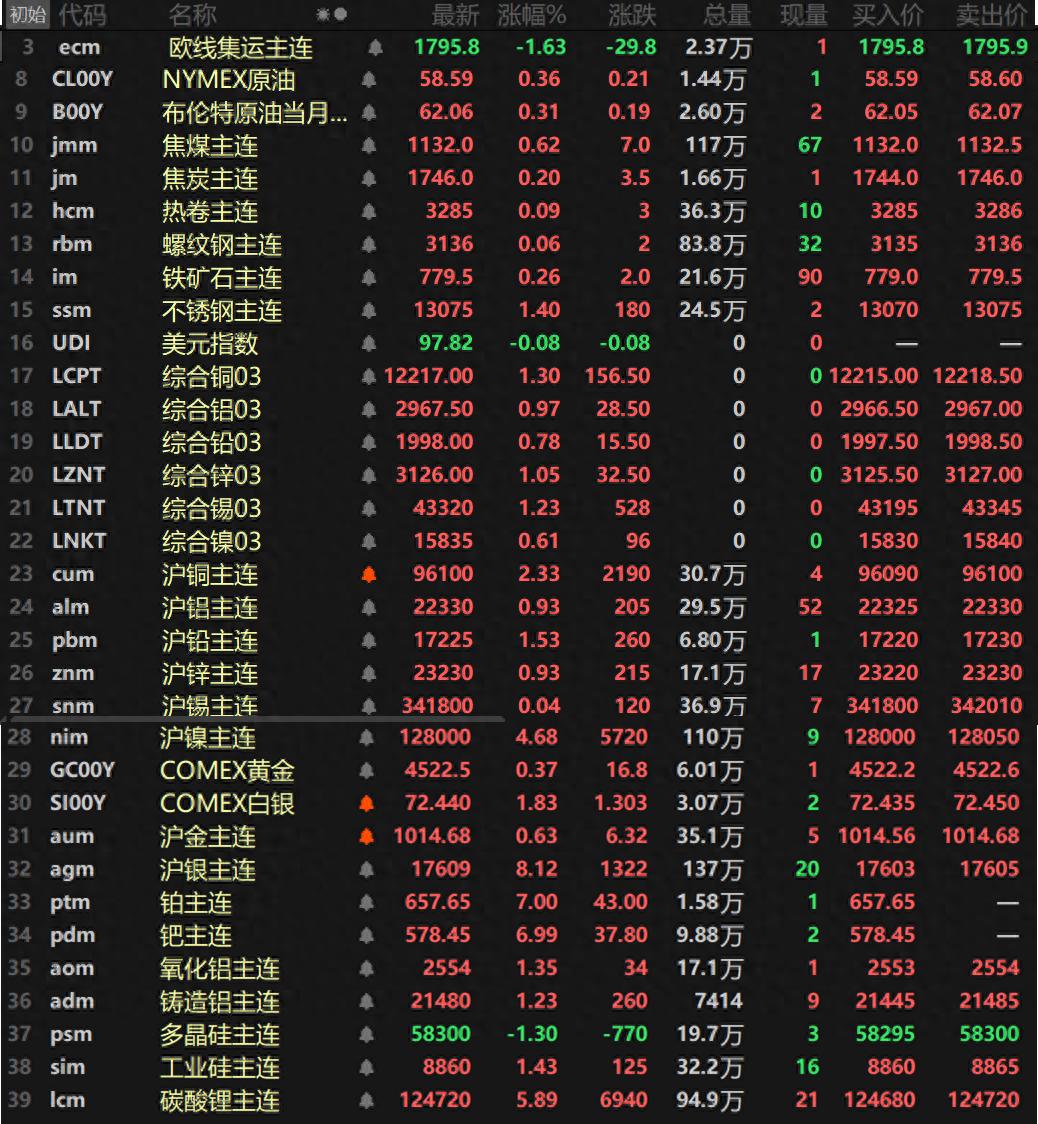 贵金属方面,截至15:04分,COMEX黄金涨0.37%,盘中续刷其历史高位4555.4美元/盎司,COMEX白银涨1.83%,其盘中最高冲至72.75美元/盎司,续刷其上市以来的历史新高。国内方面,沪金涨0.63%,盘中刷新历史新高至1022.88元/克;沪银涨8.12%,其盘中最高冲至17671元/千克,继续刷新历史记录。