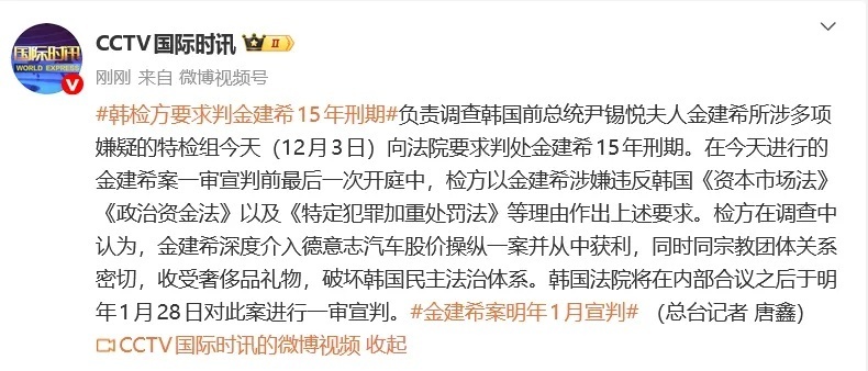 此外,据CCTV国际时讯消息,负责调查韩国前总统尹锡悦夫人金建希所涉多项嫌疑的特检组12月3日向法院要求判处金建希15年刑期。