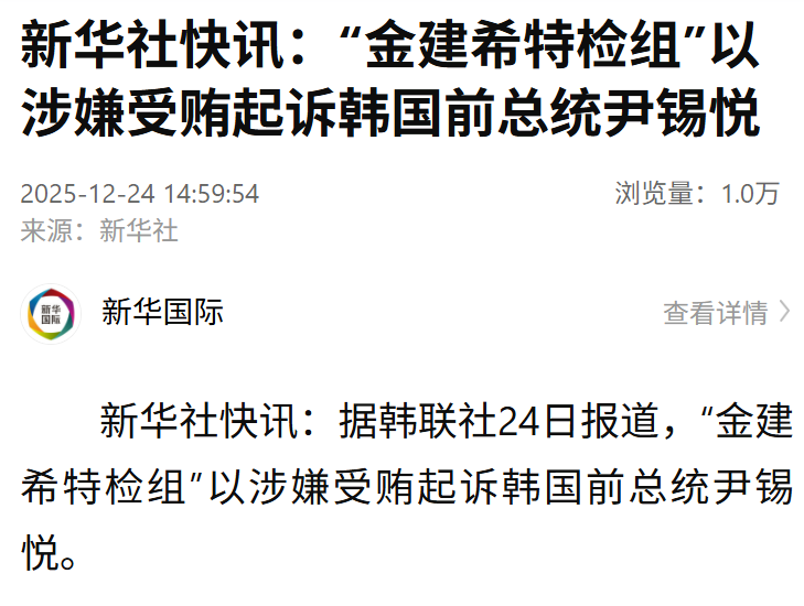 新华社快讯:据韩联社24日报道,“金建希特检组”以涉嫌受贿起诉韩国前总统尹锡悦。
