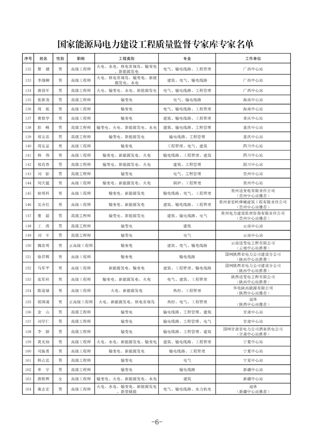 根据《电力建设工程质量监督专业人员培训考核和专家库管理办法》(国能发安全规〔2025〕58号)相关要求,为发挥专家的技术支撑和智囊助手作用,现将国家能源局电力建设工程质量监督专家库164名入库专家名单进行公布,供各单位在工作中参考使用。