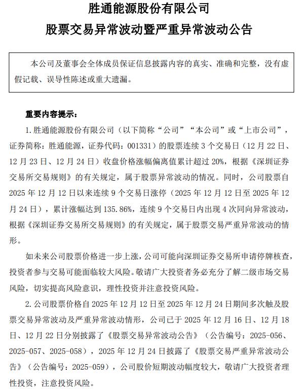 胜通能源12月24日公告,股票连续3个交易日收盘价格涨幅偏离值累计超过20%,属于股票异常波动的情况。同时,股票自2025年12月12日以来连续9个交易日涨停(2025年12月12日至2025年12月24日),累计涨幅达到135.86%,连续9个交易日内出现4次同向异常波动,属于股票交易严重异常波动的情形。如未来公司股票价格进一步上涨,公司可能向深圳证券交易所申请停牌核查,投资者参与交易可能面临较大风险。