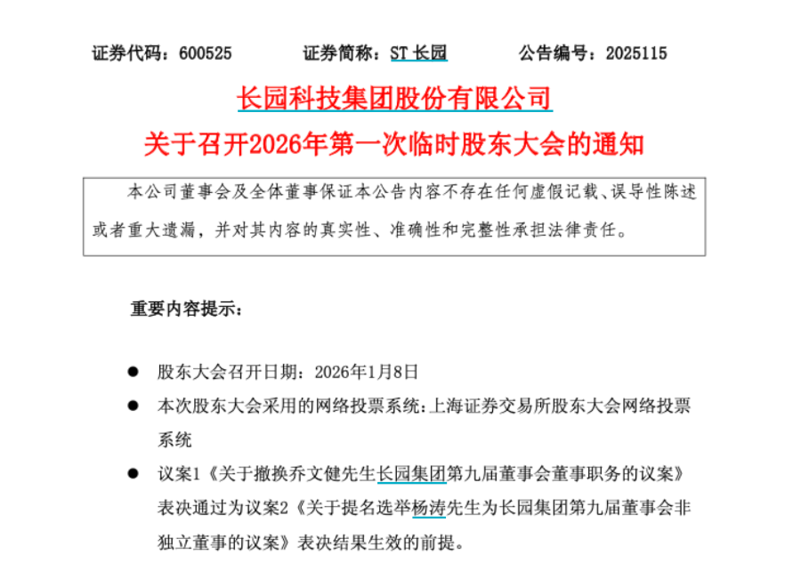 12月23日晚,ST长园(600525.SH)连发三份公告,大股东珠海格力金融投资管理有限公司(以下简称“格力金投”)向公司董事会提请召集召开临时股东会,并提出两份议案,议案一是关于撤换董事长乔文健在董事会的相关职务,议案二是提名选举杨涛为长园集团第九届董事会非独立董事。