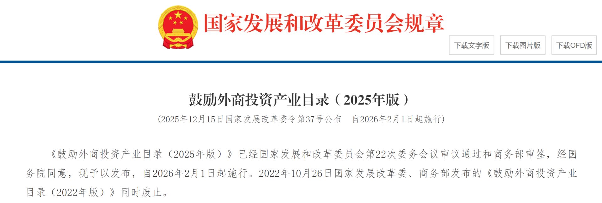 时隔三年,新版鼓励外商投资产业目录出炉,将于2026年2月1日起施行。