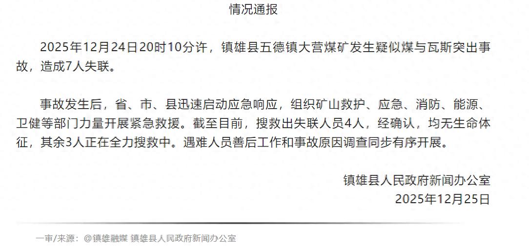 2025年12月24日20时10分许,镇雄县五德镇大营煤矿发生疑似煤与瓦斯突出事故,造成7人失联。