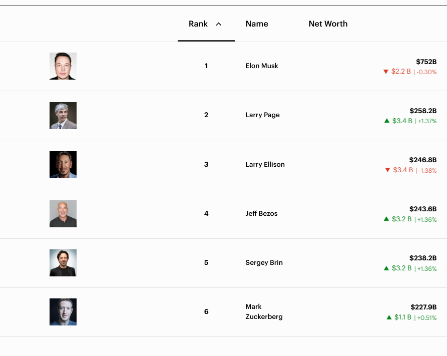 就在2025年初福布斯发布全球富豪榜时,马斯克的身家约为3420亿美元,如今还不到一年时间,他的身家已经飙涨了一倍多,超过了榜单上第2至第4名(谷歌联合创始人拉里·佩奇、甲骨文创始人拉里·埃里森、亚马逊创始人贝索斯)的总和。